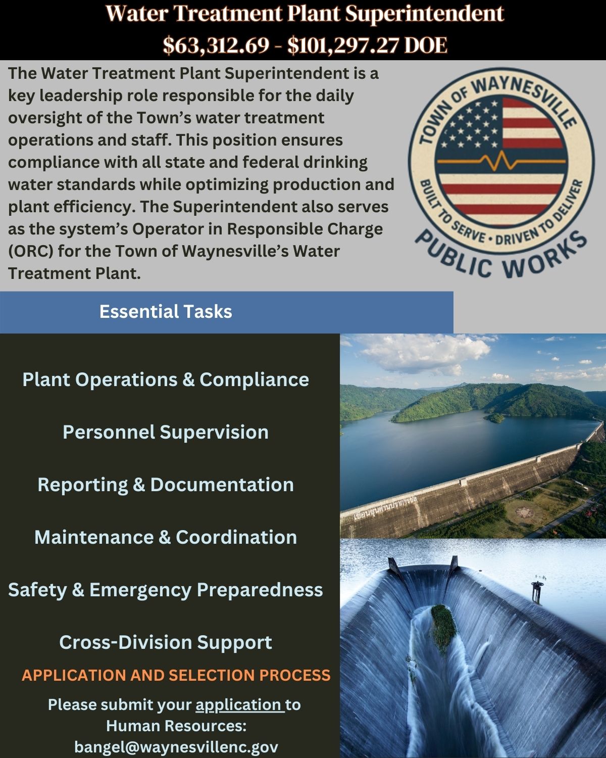 The Water Treatment Plant Superintendent is a key leadership role responsible for the daily oversight of the Town’s water treatment operations and staff. This position ensures compliance with all state and federal drinking water standards while optimizing production and plant efficiency. The Superintendent also serves as the system’s Operator in Responsible Charge (ORC) for the Town of Waynesville’s Water Treatment Plant.